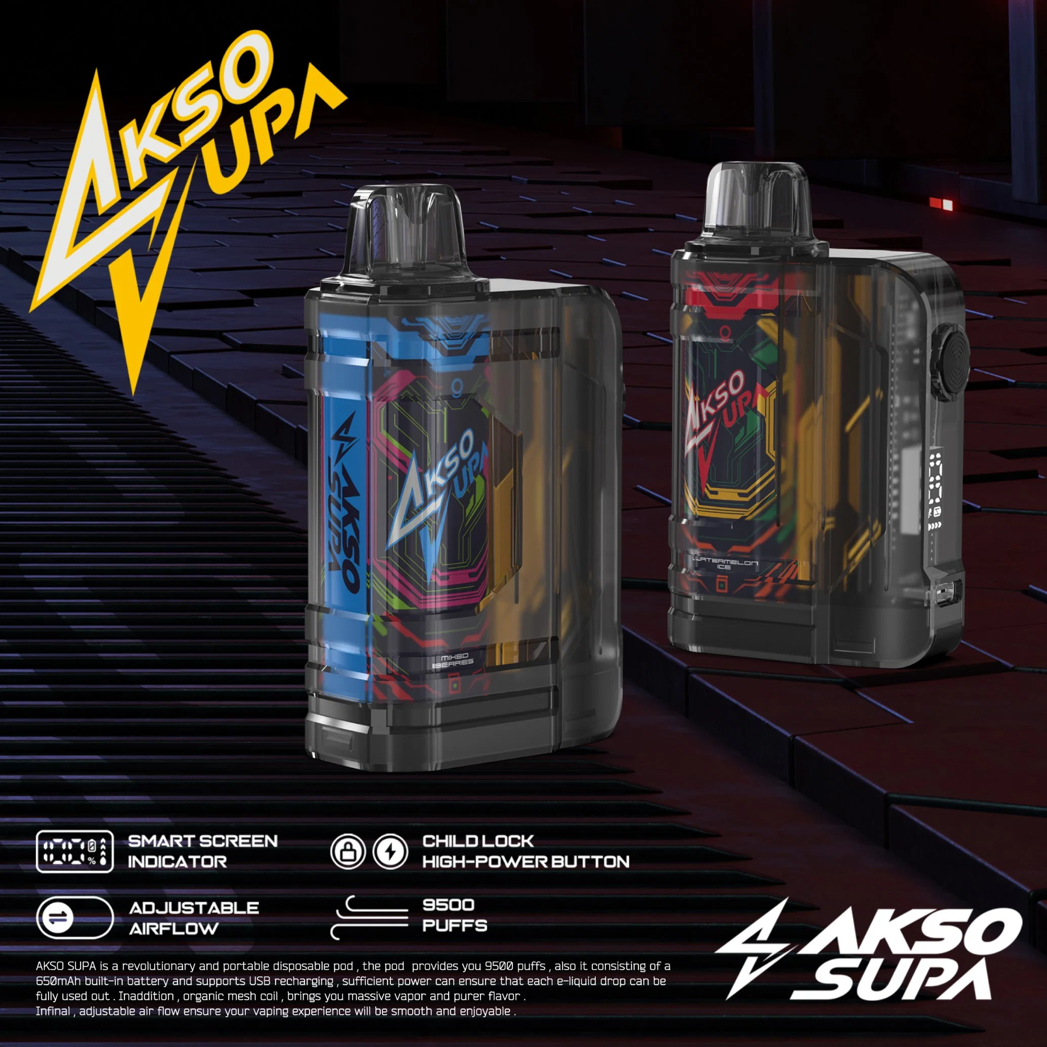 Introducing the AKSO SUPA: a cutting-edge disposable with a powerful boost button, child lock system, airflow adjuster, and a smart screen for easy monitoring of battery and e-liquid levels.